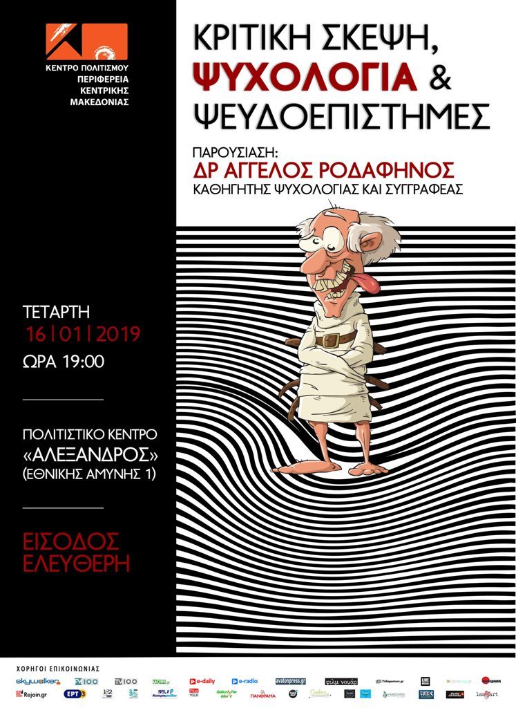 Το Κέντρο Πολιτισμού της Περιφέρειας Κεντρικής Μακεδονίας διοργανώνει σεμινάριο ψυχολογίας με ομιλητή τον Καθηγητή Ψυχολογίας και συγγραφέα Δρ Άγγελο Ροδαφηνό με τίτλο: «Κριτική Σκέψη, Ψυχολογία & Ψευδοεπιστήμες».