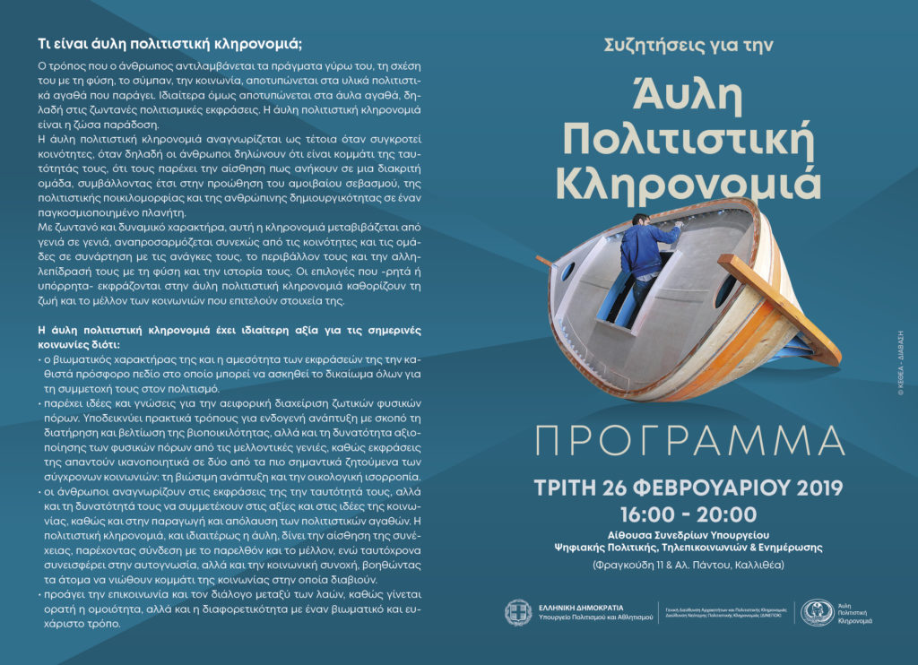 Το Υπουργείο Πολιτισμού και Αθλητισμού διοργανώνει εκδήλωση με τίτλο «Συζητήσεις για την Άυλη Πολιτιστική Κληρονομιά», η οποία θα πραγματοποιηθεί την Τρίτη 26 Φεβρουαρίου 2019, ώρα 16.00 – 20.00, στην Αίθουσα Συνεδρίων του Υπουργείου Ψηφιακής Πολιτικής, Τηλεπικοινωνιών και Ενημέρωσης (Φραγκούδη 11 & Αλ. Πάντου, Καλλιθέα).