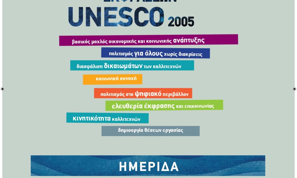 Το Υπουργείο Πολιτισμού & Αθλητισμού διοργανώνει Ημερίδα για τη Σύμβαση  για την Προστασία και Προώθηση της Ποικιλομορφίας των Πολιτιστικών Εκφράσεων (UNESCO 2005), την Τετάρτη 8 Νοεμβρίου 2017, στο Αμφιθέατρο του ΥΠΠΟΑ, Μπουμπουλίνας 20-22, ώρα 09:00 έως 15:30.