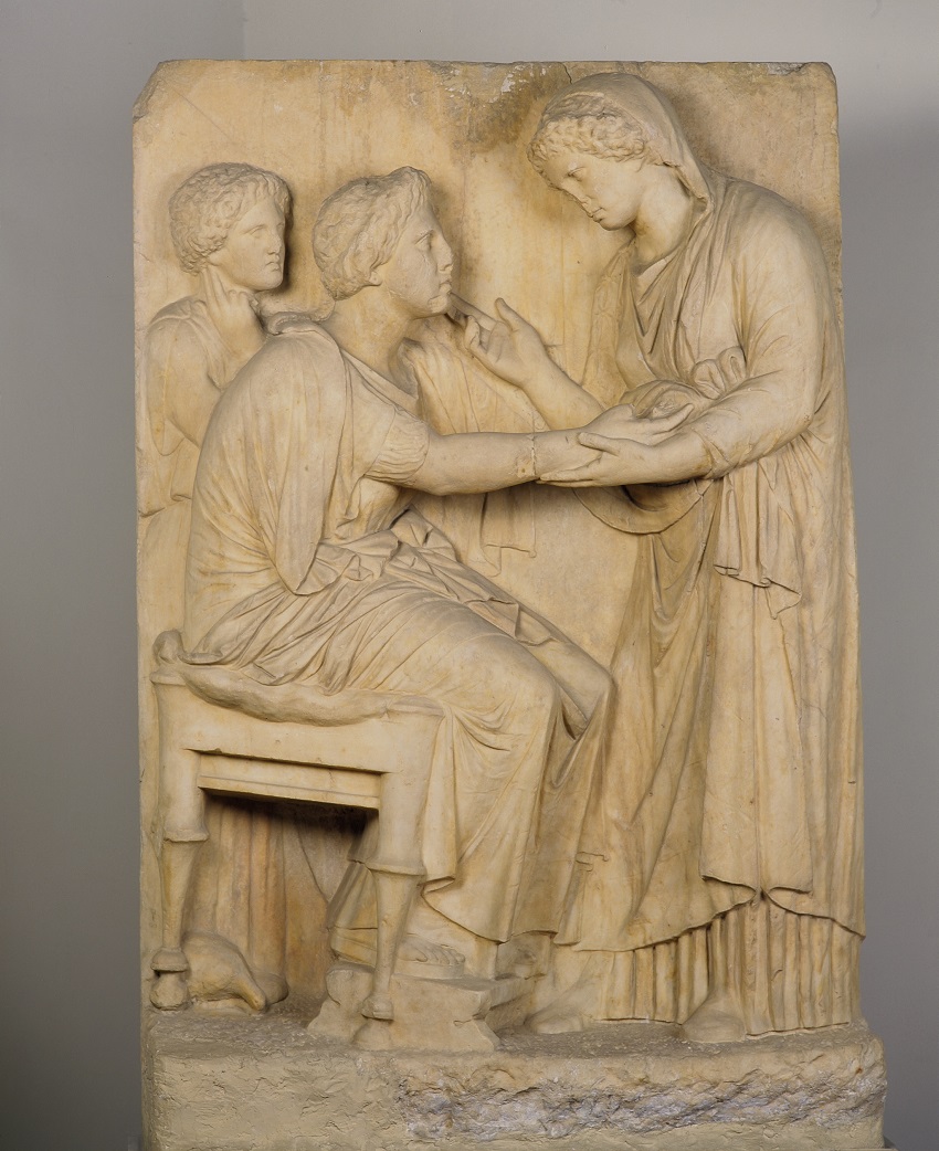 Πρόκειται για έργο που χρονολογείται το 350-325 π.Χ. και συγκινεί με την αμεσότητα του θέματος. Η νεκρή κάθεται σε σκαμνί απλώνοντας το χέρι προς μια συγγενή της που το κρατά τρυφερά από τον καρπό και της απευθύνει το λόγο υψώνοντας το άλλο της χέρι. Αριστερά στέκεται συλλογισμένο ένα κορίτσι. Κάτω από το κάθισμα της νεκρής ραμφίζει μια πέρδικα. Το μνημείο, γνωστό ως στήλη του αποχαιρετισμού είχε άλλοτε μορφή ναϊσκου με αέτωμα, παραστάδες και βάθρο.