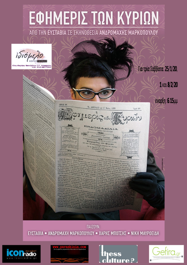 «Η Εφημερίς των Κυριών», που εξεδόθη για πρώτη φορά στις 8 Μαρτίου του 1887 από την Καλλιρρόη Παρρέν, ξαναδιαβάζεται από την Ευσταθία σε μια παράσταση μετά μουσικής. Η πρώτη εφημερίδα φτιαγμένη από γυναίκες για γυναίκες. Γυναίκες μιας άλλης εποχής, χωρίς βασικά δικαιώματα, μην έχοντας πρόσβαση στη μόρφωση και καμία εξουσία πάνω στον εαυτό τους.