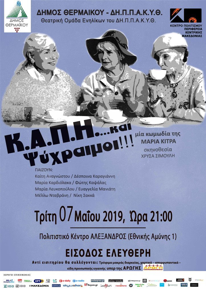 Το Κέντρο Πολιτισμού της Περιφέρειας Κεντρικής Μακεδονίας διοργανώνει τη θεατρική παράσταση «Κ.Α.Π.Η. … και Ψύχραιμοι» από την Θεατρική Ομάδα Ενηλίκων του ΔΗ.Π.Π.Α.Κ.Υ.Θ. –  Δήμου Θερμαϊκού, μία κωμωδία της Μαρίας Κίτρα σε σκηνοθεσία Χρύσας Σιμούλη.