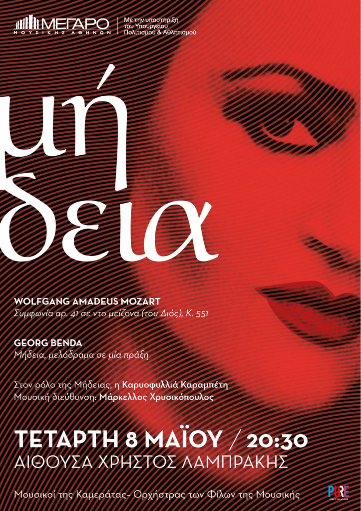 Δύο εμβληματικά έργα που σημάδεψαν την κλασική περίοδο της μουσικής παρουσιάζουν Οι Μουσικοί της Καμεράτας–Ορχήστρας των Φίλων της Μουσικής την Τετάρτη 8 Μαΐου στις 8:30 το βράδυ στην Αίθουσα Χρήστος Λαμπράκης. Στη συναυλία αυτή, το κοινό θα έρθει πιο κοντά στον δωρικό συμφωνικό ήχο του 18ου αιώνα μέσα από το ηχόχρωμα των οργάνων εποχής του φημισμένου συνόλου και θα ανακαλύψει το μονόπρακτο μελόδραμα Μήδεια του τσέχου συνθέτη Georg Benda [Γκέοργκ Μπέντα], που έζησε στα χρόνια του Μότσαρτ, στο οποίο πρωταγωνιστεί η Καρυοφυλλιά Καραμπέτη, μια από τις σπουδαιότερες σύγχρονες θεατρικές Μήδειες. H διακεκριμένη ηθοποιός θα ερμηνεύσει τον ρόλο σε δική της μετάφραση στα ελληνικά.