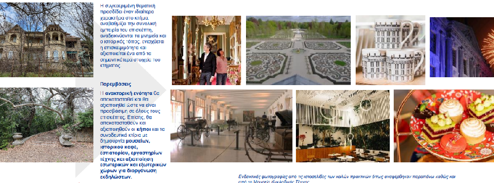 Το βασικό σκεπτικό της μελέτης, και με βάση αυτά τα οποία είπαμε προηγουμένως,  αναπτύσσονται θεματικά οι εξής δραστηριότητες: «Ιστορία και Πολιτισμός». Οι δραστηριότητες του Πολιτισμού θα αναπτυχθούν κυρίως στην ανακτορική κτηριακή ενότητα δημιουργώντας ένα πόλο έλξης με ιστορικό και πολιτιστικό περιεχόμενο, σε απόλυτη αρμονία με το περιβάλλον και την ταυτότητα του κτήματος. Οι παρεμβάσεις οι οποίες προτείνονται εδώ είναι στην ουσία δουλειές, τα έργα, οι εργασίες τις οποίες έχουν δρομολογήσει, θα εκτελέσουν και θα συνεχίσουν να εκτελούν στο μέλλον οι υπηρεσίες του Υπουργείου Πολιτισμού. Η ανακτορική ενότητα αποκαθίσταται και αξιοποιείται ώστε να είναι προσβάσιμη σε όλους τους επισκέπτες. Επίσης, αποκαθίστανται και αξιοποιούνται οι κήποι και τα συνοδευτικά κτίρια για χρήση καφέ, εστιατορίων, εργαστηρίων και διαφόρων εκδηλώσεων.