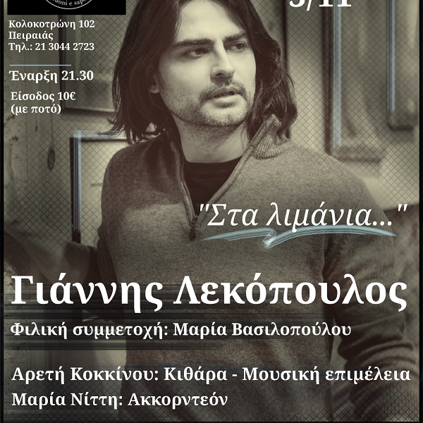 Η πετυχημένη μουσική παράσταση «Στα λιμάνια…» επιστρέφει στον Πειραιά, εκεί από όπου ξεκίνησε και αγαπήθηκε από το κοινό. Την Παρασκευή 5 Νοεμβρίου στον πεζόδρομο του «Sound Βistro», ο Γιάννης Λεκόπουλος μαζί με την συνθέτρια Αρετή Κοκκίνου στην κιθάρα και την Μαρία Νίττη στο ακκορντεόν, μας παρασύρουν σε ένα μουσικό ταξίδι από λιμάνι σε λιμάνι…