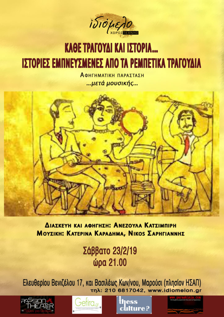 Αφηγηματική παράσταση με ιστορίες εμπνευσμένες από τα ρεμπέτικα τραγούδια.