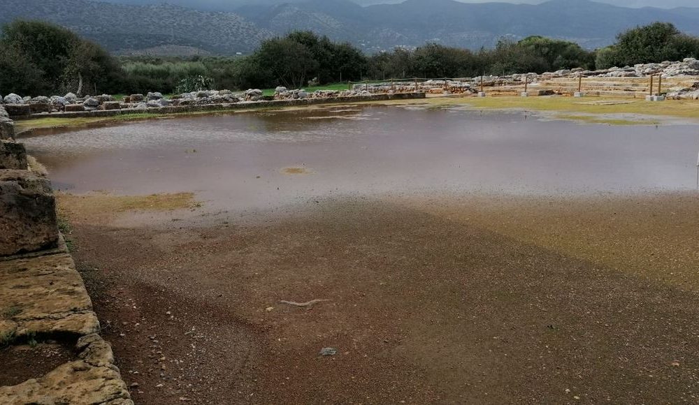 Μεγάλος όγκος υδάτων εισήλθε και στο εσωτερικό των ανεσκαμμένων χώρων από τα στέγαστρα προστασίας, καθώς τα κανάλια απορροής των ομβρίων υπερχείλισαν από την ένταση της βροχής. Διαπιστώθηκε ότι η κλίση των καναλιών απορροής είναι εσφαλμένη με αποτέλεσμα να μην λειτουργούν ικανοποιητικά σε βροχή μεγάλης έντασης. Αλλά και η στάθμη του εδάφους περιμετρικά των ανεσκαμμένων χώρων είναι υψηλότερη και δεν έχουν προβλεφθεί αποστραγγιστικές τάφροι. Ετσι, τα όμβρια που απορρέουν από τα στέγαστρα και τα πέριξ αυτών, κατέληξαν στο εσωτερικό των χώρων, τόσο του Quartier Mu -συνοικία εργαστηρίων- όσο και στον παρακείμενο χώρο της Υπόστυλης Κρύπτης, παρά την ύπαρξη φρεατίου απορροής. Κατά τη σημερινή αυτοψία, διαπιστώθηκε ότι επικάθησε στα δάπεδα παχύ στρώμα λάσπης το οποίο, θα απομακρυνθεί από τους συντηρητές, όταν στεγνώσει. Τότε θα είναι εφικτή η συνολικότερη αποτίμηση της κατάστασης των επιχρισμάτων. Πάντως μέχρι στιγμής, δεν υπάρχουν καταρρεύσεις τοίχων ή άλλες σοβαρές καταστροφές. Οι μηχανικοί και συντηρητές της Εφορείας θα συντάξουν λεπτομερείς τεχνικές εκθέσεις για την αντιμετώπιση των προβλημάτων.