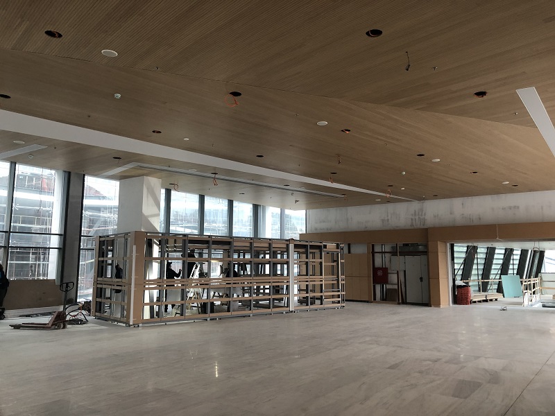 Ήδη έχει ολοκληρωθεί η τοποθέτηση των ξύλινων επενδύσεων και κατασκευών. Έχουν τοποθετηθεί τα ξύλινα δάπεδα. Ολοκληρώνονται οι ψευδοροφές και ταυτόχρονα ο φωτισμός. Στο foyer κατασκευάζεται το βεστιάριο, ενώ τις επόμενες εβδομάδες εγκαθίσταται και ο ψηφιακός εξοπλισμός.