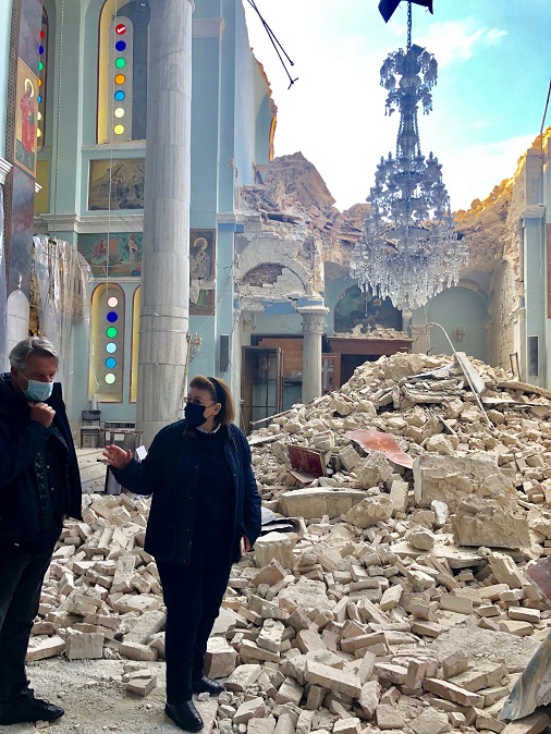 Μετά την αυτοψία η κ. Μενδώνη δήλωσε «οι ζημιές είναι αρκετές. Όμως μπορούν να αποκατασταθούν. Θα γίνει ο προγραμματισμός, ώστε τις επόμενες ημέρες να παρίσταται επί τόπου κλιμάκιο του Υπουργείου Πολιτισμού και Αθλητισμού για τις καταγραφές των ζημιών στα μνημεία. Συγχρόνως, το κλιμάκιο του Υπουργείου θα βοηθήσει την Τοπική Αυτοδιοίκηση σε μία σειρά άμεσων ενεργειών. Αυτό που επείγει είναι να υποστηλωθούν τα μνημεία για να μην υπάρξει κίνδυνος για την ανθρώπινη ζωή. Η απώλεια των δύο παιδιών μας έχει συγκλονίσει. Θα μπορούσε να είχε αποφευχθεί, αν υπήρχε μέριμνα για τα ερειπωμένα κτήρια. Στα Μουσεία Βαθέος και Πυθαγορείου δεν έχουμε προβλήματα. Αποκολλήθηκε ένα σημείο στη συγκόλληση του μεγάλου Κούρου. Αποκολλήθηκε τμήμα του γύψου. Το ίδιο το άγαλμα δεν έπαθε τίποτα. Τα γλυπτά είναι όλα στη θέση τους. Μετακινήθηκαν από τις βάσεις τους ελάχιστα αντικείμενα, αγγεία και χάλκινα. Επομένως δεν έχομε απώλειες. Σε ό,τι αφορά τις εκκλησίες που είναι μνημεία και χρήζουν προστασίας,  θα πάρουμε τα άμεσα σωστικά μέτρα. Θα υποστηλωθούν, θα μπουν τυχόν περιφράξεις, για να  μην υπάρχει κίνδυνος για τους πολίτες. Είναι πολλή η δουλειά που πρέπει να γίνει. Με τη βοήθεια των ειδικών θα γίνουν οι μελέτες αποκατάστασης. Χρειάζεται αρκετή δουλειά και σωστός σχεδιασμός”.