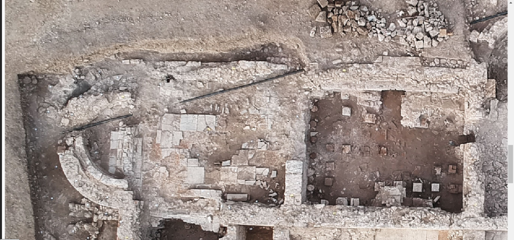 Στο νότιο ανεσκαμμένο τμήμα του συγκροτήματος εντοπίστηκαν τέσσερις αίθουσες. Από αυτές μια φέρει κτιστά θρανία περιμετρικά στους τοίχους της και διατρέχεται από κιονοστοιχεία με κατεύθυνση Α/Δ. Στο δάπεδό της βρέθηκε καταπεσμένο ιωνικό κιονόκρανο και ένας κίονας. Η αίθουσα αυτή επικοινωνεί στα ανατολικά με μια δεύτερη, η οποία φέρει λουτήρες και αυτή με τη σειρά της επικοινωνεί στα βόρεια με το caldarium και στα νότια με κολυμβητική δεξαμενή, της οποίας ένα μόνον τμήμα διερευνήθηκε φέτος. Ανατολικά αποκαλύφθηκε τρίτη αίθουσα, η οποία περιλαμβάνει λουτήρα και εκτεταμένο πήλινο δάπεδο, το οποίο διατηρείται σε εξαιρετικά καλή κατάσταση. Κάτω από το δάπεδο εντοπίστηκε μολύβδινος αγωγός στην επιφάνεια του οποίου αναγράφεται το όνομα του κατασκευαστή. Η αίθουσα αυτή εκτείνεται σε όλο το μήκος του διερευνηθέντος λουτρικού συγκροτήματος στον άξονα Β/Ν. Στο εσωτερικό της εντοπίστηκε σε στρώμα καταστροφής καταπεσμένο δωρικό κιονόκρανο και κίονας με ραβδώσεις. Τέλος, στο ΝΔ τμήμα του λουτρού βρέθηκε χώρος στον οποίο απολήγει αγωγός απορροής υδάτων που διατρέχει υποδαπέδια τις παραπάνω αίθουσες. Στον τελευταίο αυτό χώρο εντοπίστηκαν αποθέσεις χρηστικών αγγείων ελληνιστικών και ρωμαϊκών χρόνων, κεφαλή πήλινου ειδωλίου, πληθώρα θραυσμάτων γυάλινων μοιροδοχείων, καθώς και αποτμήματα υαλοθετημάτων επάνω σε κονίαμα. Κατά τη διάρκεια της ανασκαφής των λουτρών βρέθηκαν 130 νομίσματα που χρονολογούνται από την ελληνιστική έως και την υστερο-ρωμαϊκή περίοδο. Ορισμένα από αυτά ανήκουν σε νομισματικούς θησαυρούς.