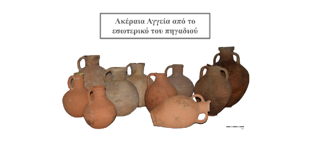 Τα ευρήματα είναι κυρίως μικρογραφικά αγγεία, τρία πήλινα ειδώλια αλόγων, ζωόμορφος αρύβαλλος, δακτυλιόσχημος αρύβαλλος με πλαστικό στόμιο που απεικονίζει σειρήνα, αστράγαλος με επίχρισμα ερυθρού χρώματος, δύο σιδερένια ομοιώματα τράπεζας κ.α. Από το εσωτερικό του πηγαδιού το οποίο διερευνήθηκε σε βάθος 15μ. ανασύρθηκε μεγάλη ποσότητα αρχιτεκτονικών μελών αρχαϊκής, κλασικής και ελληνιστικής περιόδου, επιζωγραφισμένες σίμες, βάση μαρμάρινου αγαλματιδίου στο οποίο διατηρείται κεφάλι σκύλου και πόδια ανδρικής μορφής, πιθανόν Μελέαγρου, κορμός αγαλματιδίου γυμνής γυναικείας μορφής, πιθανόν Αφροδίτης, άνω τμήμα γυμνού κορμού μαρμάρινου γυναικείου αγαλματιδίου, πάνω από 60 αμφορείς και οινοχόες, κεραμική από τους αρχαϊκούς έως τους ύστερους ρωμαϊκούς χρόνους, νομίσματα ρωμαϊκών και υστερο-ρωμαϊκών χρόνων και μια αιχμή σιδερένιου δόρατος.