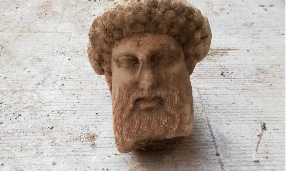 Η κεφαλή είχε εντοιχιστεί σε β΄ χρήση στο νότιο πλευρικό τοιχίο σύγχρονου συνδετήριου αγωγού αποχέτευσης. Το εύρημα που διατηρείται σε καλή κατάσταση, αμέσως μετεφέρθη σε αποθήκη της Εφορείας Αρχαιοτήτων.