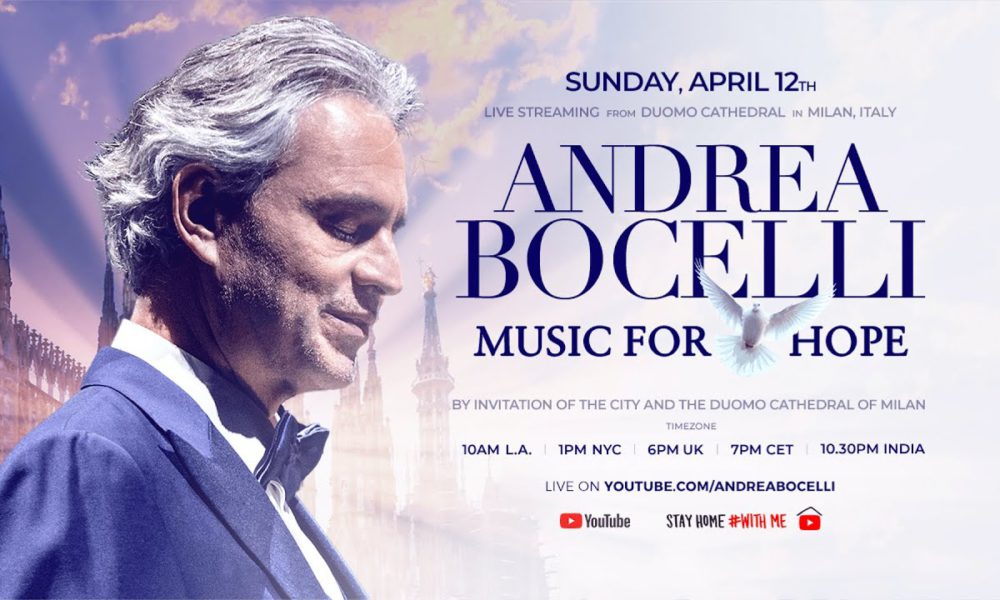 Στις 12 Απριλίου, ο Ιταλός τενόρος και παγκόσμιο μουσικό icon Andrea Bocelli, θα δώσει μία solo συναυλία χωρίς τη προέλευση του κόσμου, στον ιστορικό καθεδρικό ναό του Μιλάνου, Duomo. Ο Δήμαρχος του Μιλάνου αυτοπροσώπως προσκάλεσε τον Andrea Bocelli για αυτή την εμφάνιση, που θα μεταδοθεί live από το επίσημο κανάλι του τενόρου στο YouTube.