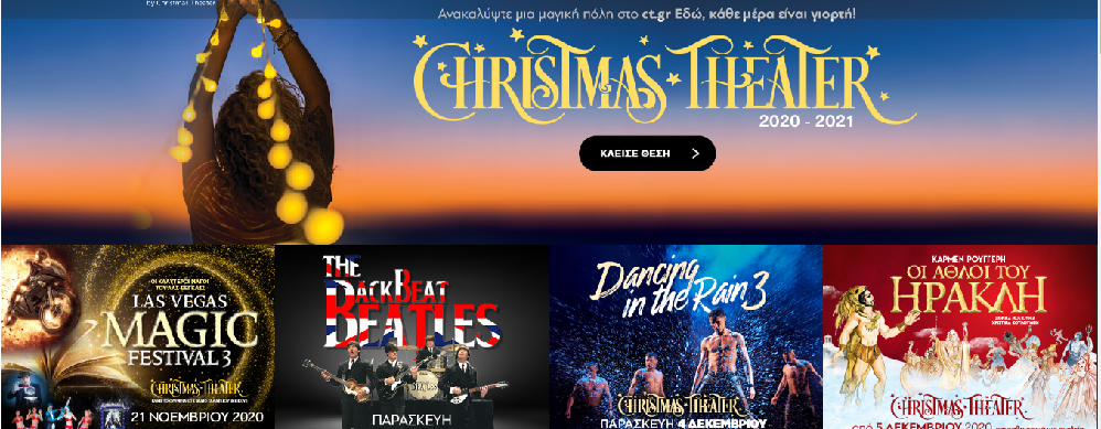 Αυτές τις γιορτές μένουμε ασφαλείς και γιορτάζουμε με μια λαμπερή έξοδο τα Χριστούγεννα ταξιδεύοντας σε όλο τον κόσμο με την τέχνη, που έχει τη δύναμη να εξαφανίζει όλα τα σύνορα.. Το Christmas Theater είναι εδώ και ετοιμάζετε για τις πιο ασφαλείς και αστραφτερές γιορτές της ζωής σας. Γιατί τις αξίζουμε! Τα δύο προηγούμενα Χριστούγεννα 350.000 θεατές έκαναν check in στο πρώτο θεματικό θέατρο της Αθήνας. Πάνω από 1000 καλλιτέχνες από όλο τον κόσμο μας ταξίδεψαν με την τέχνη στις πιο λαμπερές πρωτεύουσες της γης.Το Christmas Theater 2020-2021 ήδη ετοιμάζεται.. Επιλέξτε το, γιατί αυτά τα Χριστούγεννα.. Μένουμε ασφαλείς και απολαμβάνουμε ταξίδια με θέατρο, χορό, συναυλίες! Το φετινό πρόγραμμα θα ανακοινώνεται σταδιακά. Ήδη οι πρώτες προπωλήσεις ξεκίνησαν: Σάββατο 21 Νοεμβρίου LASVEGASMAGICFESTIVAL 3: Οι καλύτεροι μάγοι του Λας Βέγκας Μπορείτε να κατεβάσετε το δημοσιογραφικό υλικό πατώντας πάνω στην εικόνα Παρασκευή 27 Νοεμβρίου BACKBEATBEATLES: Το καλύτερο musicaltributeγια τα θρυλικά σκαθάρια Παρασκευή 4 Δεκεμβρίου DANCINGINTHERAIN 3: Ο χορός στην βροχή επιστρέφει στην Αθήνα Από το Σάββατο 5 Δεκεμβρίου ΟΙ ΑΘΛΟΙ ΤΟΥ ΗΡΑΚΛΗ της Κάρμεν Ρουγγέρη Παρασκευή 11 Δεκεμβρίου ABBAMANIA: Το διάσημο musicaltributeγια τους Abbaέρχεται ξανά στην Αθήνα Τετάρτη 16 Δεκεμβρίου ΠΑΝΟΣ ΔΗΜΗΤΡΑΚΟΠΟΥΛΟΣ – ΠΑΝΤΕΛΗΣ ΘΑΛΑΣΣΙΝΟΣ – ΝΙΚΟΣ ΞΥΔΑΚΗΣ – ΕΥΑΝΘΙΑ ΡΕΜΠΟΥΤΣΙΚΑ Παρασκευή 18 με Τρίτη 22 Δεκεμβρίου Η ΛΙΜΝΗ ΤΩΝ ΚΥΚΝΩΝ ΣΤΟΝ ΠΑΓΟ: Το κλασικό μπαλέτο συναντά το καλλιτεχνικό πατινάζ Κυριακή 3 Ιανουαρίου 2021 Η ΜΑΣΑ ΚΑΙ Ο ΑΡΚΟΥΔΟΣ: Η μεγάλη Χριστουγεννιάτικη παιδική θεατρική παραγωγή μεταγλωττισμένη στα Ελληνικά Τρίτη 5 Ιανουαρίου 2021 FRANK SINATRA AND FRIENDS Το καλύτερο αφιέρωμα στον Φρανκ Σινάτρα έρχεται για πρώτη φορά στην Αθήνα Σάββατο 30 Ιανουαρίου 2021 SHAOLIN THE LEGEND Ζήστε από κοντά τον μύθο των Σαολίν
