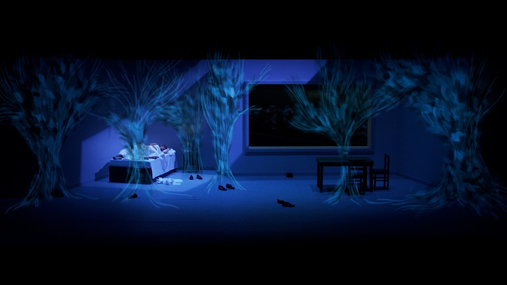 Η σκηνοθεσία αποτολμά μια μείξη νατουραλιστικής παρατήρησης και αισθητικής παραδοξότητας, στο φως της ημέρας και με σκηνικό τον εξωτερικό χώρο μιας παραθαλάσσιας, παρηκμασμένης βίλας. Εκεί, η ηρωίδα επιδίδεται σε «ασκήσεις ενδοσκόπησης» με τη σύμπραξη έξι χορευτών, καλώντας τον θεατή να βάλει σε τάξη τις εικόνες που κατακλύζουν τον λόγο της «με τον τρόπο της φαντασίας».