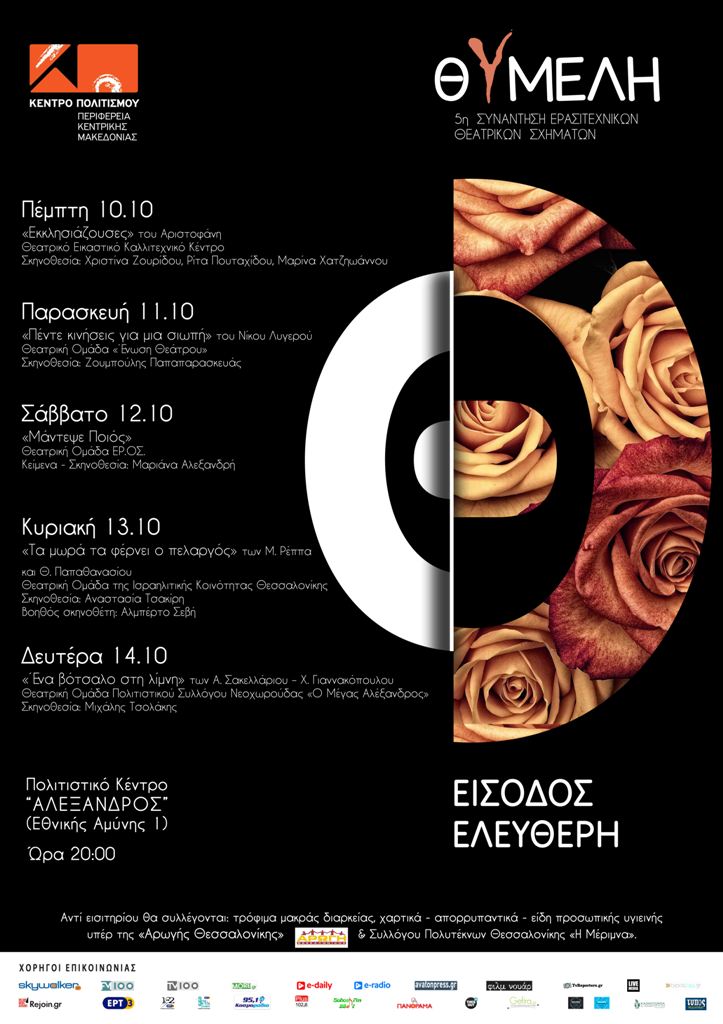 Το Κέντρο Πολιτισμού της Περιφέρειας Κεντρικής Μακεδονίας διοργανώνει την 5η ΣΥΝΑΝΤΗΣΗ ΕΡΑΣΙΤΕΧΝΙΚΩΝ ΘΕΑΤΡΙΚΩΝ ΣΧΗΜΑΤΩΝ «ΘΥΜΕΛΗ» στο Πολιτιστικό Κέντρο «Αλέξανδρος» (Εθνικής Αμύνης 1) 10.10 – 14.10.2019 και ώρα 20:00