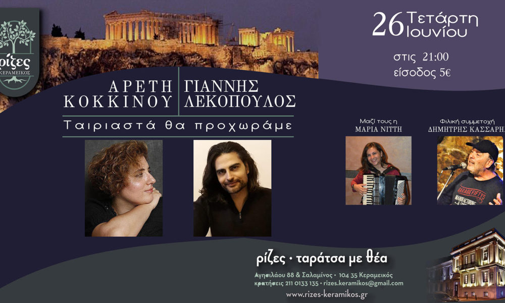 Συνεχίζοντας τις επιτυχημένες κοινές τους εμφανίσεις, ο ερμηνευτής Γιάννης Λεκόπουλος μαζί με τη συνθέτη – κιθαρίστα Αρετή Κοκκίνου και την ακκορντεονίστα Μαρία Νίττη, επιστρέφουν με ένα νέο live στις Ρίζες Κεραμεικός «Ταράτσα με θέα» ,σε ένα πρόγραμμα με ιδιαίτερες επιλογές από τη δισκογραφία τους και όλο το φάσμα του ποιοτικού ελληνικού τραγουδιού.