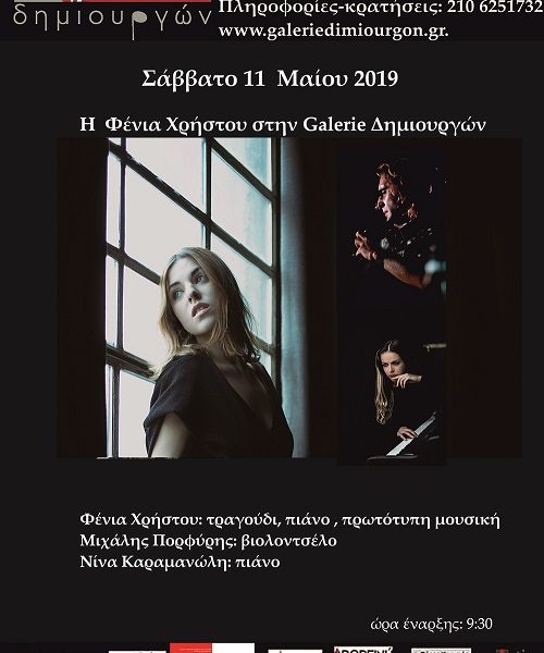 Συντροφιά με την πιανίστα Νίνα Καραμανώλη και τον βιολοντσελίστα Μιχάλη Πορφύρη, η βραβευμένη μουσικός Φένια Χρήστου εγκαινιάζει τον κύκλο των μουσικών της συναντήσεων το Σάββατο στις 11 Μαΐου, στην γκαλερί δημιουργών στην Κηφισιά. Στο πρώτο μέρος, θα ακουστούν ιδιαίτερες επιλογές από Έλληνες συνθέτες πριν καταλήξουμε σε μελοποιήσεις της ίδιας, μουσικά στιγμιότυπα από την μέχρι τώρα εργασία της στην ποίηση. Στο δεύτερο μέρος, θα ακουστεί αποκλειστικά πρωτότυπη μουσική της Φένιας Χρήστου, ορχηστρικά μέρη και τραγούδια της από τον προσωπικό της δίσκο Εl3ven ο οποίος κυκλοφόρησε τον περασμένο Μάιο από τον Μετρονόμο και έχει λάβει εξαιρετικές κριτικές καθώς και νέο ανέκδοτο υλικό. Μία μαγική βραδιά περιμένει το κοινό της γκαλερί, στην Κηφισιά…»