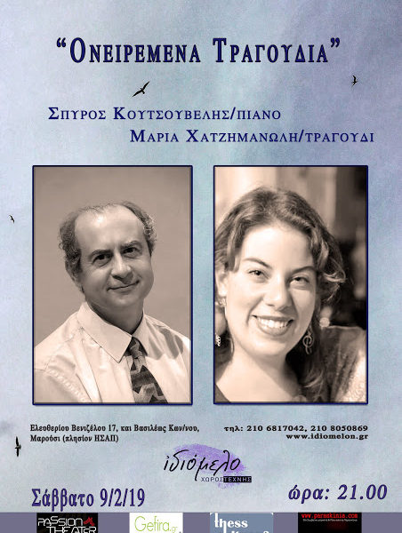Μια βραδιά με “Ονειρεμένα Τραγούδια” επιφυλάσσουν η τραγουδίστρια Μαρία Χατζημανώλη και ο πιανίστας Σπύρος Κουτσουβέλης στο Ιδιόμελο, σε ένα μουσικό ταξίίδι από το αμερικάνικο μιούζικαλ, τον Bernstein και τον Kurt Weill, μέχρι τον Γούναρη, ταν Σουγιούλ και τον Γιαννίδη…