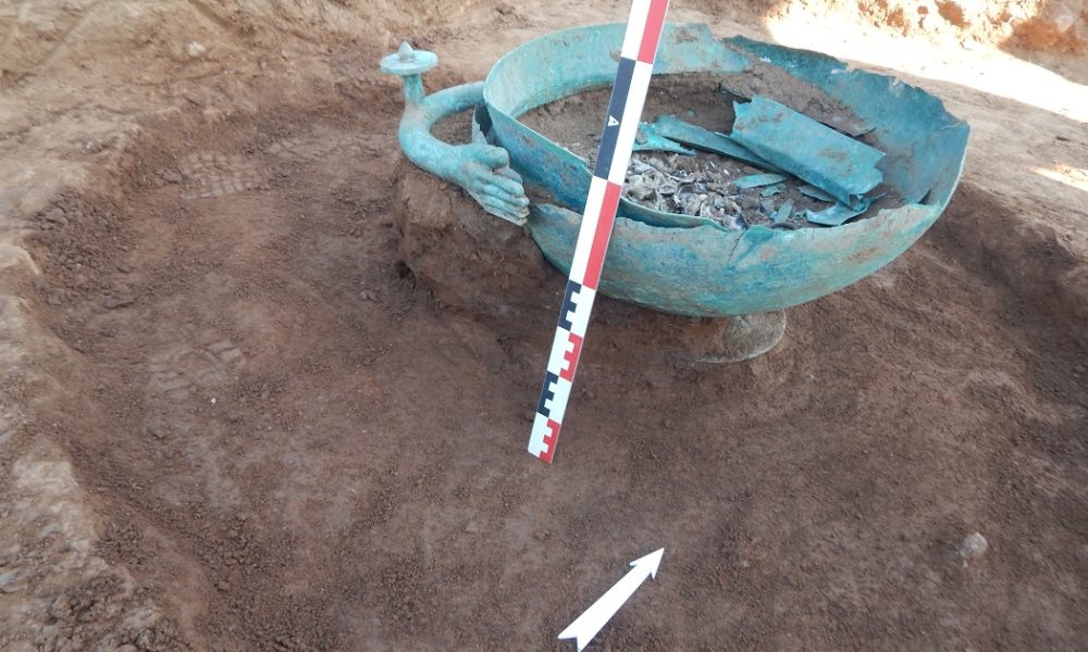 Σε πέντε ταφές εφαρμόστηκε η πρακτική της δευτερογενούς καύσης. Η μία εντοπίστηκε σε μεγάλο κρατηρόσχημο χάλκινο αγγείο, εξαιρετικό δείγμα της αρχαίας μεταλλοτεχνίας. Το αγγείο σώζεται σε σχετικά καλή κατάσταση, έχει διάμετρο 0,55μ. και φέρει πλαστική λαβή, που απολήγει σε δύο προσφύσεις με τη μορφή ανθρώπινων χεριών. Πρόκειται για δευτερογενή καύση ανδρός, και μάλιστα πολεμιστή, όπως υποδηλώνουν τα κτερίσματα: δύο σιδερένια ξίφη, δύο σιδερένια δόρατα και ένα χάλκινο κράνος «ιλλυρικού τύπου» πλαισίωναν το αγγείο, το οποίο καλυπτόταν με οριζόντια τοποθετημένη σχιστολιθική πλάκα.