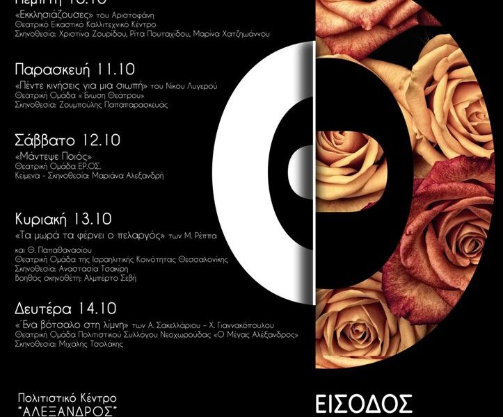 Το Κέντρο Πολιτισμού της Περιφέρειας Κεντρικής Μακεδονίας διοργανώνει την 5η ΣΥΝΑΝΤΗΣΗ ΕΡΑΣΙΤΕΧΝΙΚΩΝ ΘΕΑΤΡΙΚΩΝ ΣΧΗΜΑΤΩΝ «ΘΥΜΕΛΗ» στο Πολιτιστικό Κέντρο «Αλέξανδρος» (Εθνικής Αμύνης 1) 10.10 – 14.10.2019 και ώρα 20:00