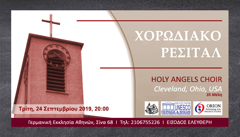 Ρεσιτάλ θρησκευτικής μουσικής με την αμερικανική χορωδία Holy Angels Choir, στη Γερμανική Εκκλησία Αθηνών, την Τρίτη 24 Σεπτεμβρίου 2019 στις 20:00, υπό την αιγίδα του Ομίλου για την UNESCO Πειραιώς και Νήσων. Το μουσικό πρόγραμμα αποτελείται από τρεις θεματικές ενότητες και περιλαμβάνει τα ακόλουθα έργα:
