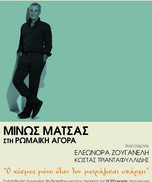 O Μίνως Μάτσας και η HOPEgenesis σας καλούν σε μια μουσική μυσταγωγία για μία και μοναδική βραδιά στον ανοικτό αρχαιολογικό χώρο της Ρωμαϊκής Αγοράς στους Αέρηδες, στην Πλάκα. Ο βραβευμένος συνθέτης με την συμμετοχή των εξαιρετικών ερμηνευτών Ελεωνόρας Ζουγανέλη και Κώστα Τριανταφυλλίδη καθώς και επτά διακεκριμένων μουσικών θα παρουσιάσει τούς πιο σημαντικούς κύκλους τραγουδιών της πορείας του την Πέμπτη, 10 Σεπτεμβρίου 2020 και ώρα 20.30.